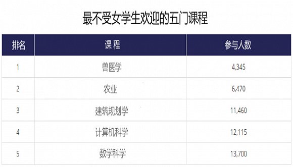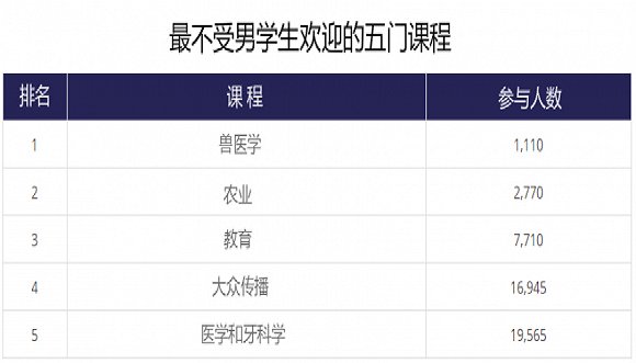 然而,当提到最不受欢迎的课程时,男生和女生则不约而同地选择了兽医学,其中,仅有4345个女学生选择了这门课,男生人数为1110。顾名思义,兽医学主要学习的是针对不同动物的治疗方法,包括解剖学、动物行为学、寄生虫学以及和胃肠病学等一系列小学科。一般情况下需要5-6年才能完成学业。兽医学是一项非常有挑战性的学科。首先你面对的是不同种群的动物,必须拥有强大的科学研究能力去处理各种动物的不同状况,因此需要相当长的一段时间去进行学习和研究;其次,要有感知动物情绪的能力,需要照顾它们并确保它们的健康。 总而言之,选择什么专业不仅取决于你的兴趣爱好,更要考虑到未来的就业前景,因此要提前对自己所学的课程内容有所了解,慎重做出选择。