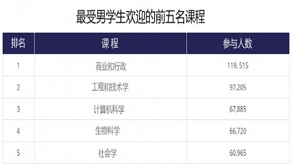 与女大学生不同的是,男学生最喜欢的课程是商业和行政,共有119,515名学生选择了相关课程;其次是工程和技术学,学生人数为97,205。商科是一项与伦理紧密联系的学科,课程内容涵盖多门学科,例如经济学、会计学和企业培训,通过协调个人、公司和政府的关系,以达到经济和资本流通的目的。而工程和技术学则包括电子、机械、土木、建筑工程和计算机工程等学科。相比之下,商科、工程和技术等学科更符合男生的逻辑思维。