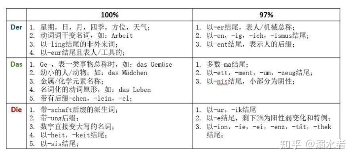 der Himmel;天 die Erde;地 der Mann;男人 die Frau;女人 der Tag;白天 die Nacht;晚上 der Frühling;春天 der Sommer;夏天 der Herbst;秋天 der Winter;冬天 这只是一个辅助技巧,但一定不能迷信这个方法!!!!一定不能迷信这个方法!!!!一定不能迷信这个方法!!!!这个方法只适用于,你实在不知道词性的时候,勉强可以用这个方法猜测一下。 然后就是联想构词法:看到不认识的单词,根据熟悉的单词和前后缀来判断新单词的意思和词性。感觉外国人都是这么记单词的。 但是,这需要对构词法有所了解,光这些词缀,可能都需要消化一阵子,运用上了更是遥遥无期。这就好比作为一个中国人,根据偏旁部首和学过的相似汉字,来判断新的汉字读音和含义。反正我是达不到这个水准,感觉更适用于词汇量较大且基础非常扎实的同学。 所以,最主要的方法还是根据词尾来记忆单词的词性。但是词尾的规则太多了,而且很多都有个例,或者只适用于一部分情况,我们不需要记忆那么多,我们只需要记住下面这张表格里的就够用了。