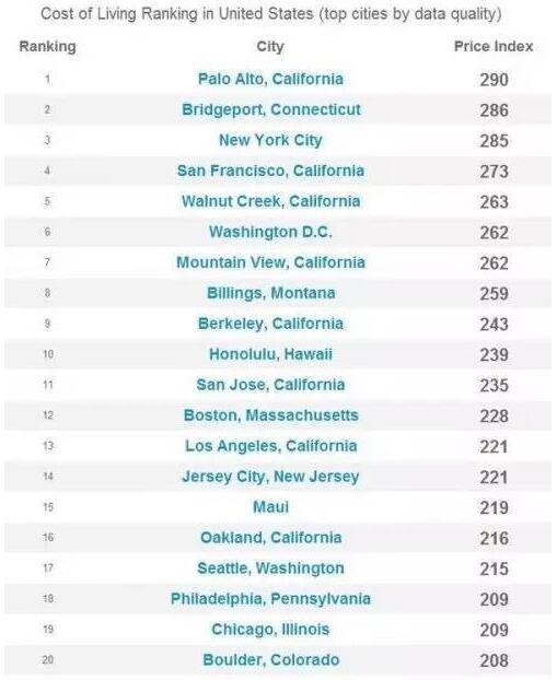 消费最高的前20个城市中,硅谷所在的Palo Alto毫无疑问是消费水平属于全国最高。另外,10个上榜的城市加州地区占了五个,这消费水平也是杠杠的。 以上就是小编为同学们整理的美国留学的生活费用和具体消费水平情况,如果有准备去美国留学的同学一定要根据自己的实际情况来进行对学校和地理位置的选择,如果资金负担重的同学也可以申请学校所设立的奖学金,这样从根本上能够解决同学们的日常消费问题,为家庭减少相应的经济负担。