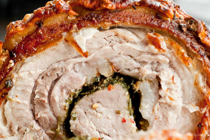 5 porchetta,ragu porchetta是一道非常非常有名的意大利烤猪肉菜,一般用猪肉的肚子做肉,里面加上rosemary,sage,thyme(三种烹调中极为出名的herb,大家可以自己查一查,一般三文鱼用thyme,牛排用rosemary,炸过的sage很适合做汤的topping),蒜,洋葱,辣椒放在肉里卷起来,然后烤箱烤七小时,因为用的pork belly,脂肪层在外面,所以烤过的猪肉外酥里嫩,十分十分好吃