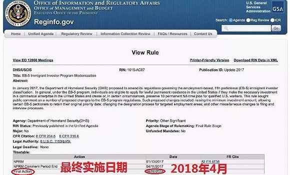 在完成了美国史上最大的税改法案之后,国会大佬们都如释重负,可以更专心地来应对之后即将要进行的美国投资移民EB-5的改革事宜,当然是要在圣诞节之后了。 那么圣诞节之后,会发生些什么? DEADLINE大幅提前美国移民局作为政府行政机构,虽然没有立法权力,但是有权力根据法律授权,变更部门的行政法规。 近日,美国白宫下属信息与规章事务办公室(Office ofInformation and Regulatory Affairs, OIRA),在官网www.reginfo.go更新了美国移民局EB-5改革方案实施时间日期,从今年9月1日时计划的2018年4月提前到了2018年2月。 2017年9月1日OIRA官网截图