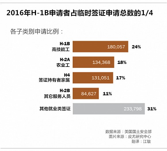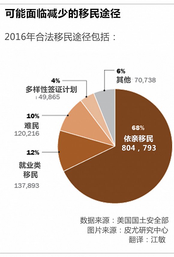 以家庭为基础的移民(Family-based immigration)根据皮尤研究中心的数据,在2016年,有804,793人通过家庭团聚类移民获得美国绿卡。该计划允许美国公民的外籍配偶、孩子、兄弟姐妹或父母申请美国永居身份。因为申请数量庞大而名额有限,大量申请人要等待多年才能被批准。 目前,依亲移民是移民美国最常见的方式,在每年接受100万移民中,通过该政策被接受的人群数量占70%左右。 显然特朗普政府认为,即便有名额限制,该政策还是太宽松。他建议限制家庭绿卡的申请者条件,仅配偶和子女才能申请,而其它家庭成员若要申请则需“打分”系统评定。参议院提出,将效仿加拿大和澳洲等过,对移民申请实行“基于技能的评分系统”(a skills-based point system)。 难民申请2016财年,美国接受84995位难民,而在特朗普上台的2017年,数字降到53716位。这是自2007年以来,美国接受难民最少的一年。而在2018年,上限将控制在45000人,这可能是1980年,美国建立难民接受制度以来,数量最低的一年。 特朗普上台后,最开始着手解决的,就是冻结难民入境,理由是他们可能会给美国带来安全问题。11个国家的申请人被视为“高风险”,要经过相关部门仔细审查才能予以批准。好消息是,2018年1月,该限制被撤销,恢复所有国家的难民申请。 以就业为基础(Employment-based)的移民该类移民申请者,前提是要在美国就业,有些类别还需要你是社会精英,不仅能贡献经济价值,最好还能创造就业。这是美国政府最喜闻乐见的移民方式。2016年,通过该政策获得绿卡的外籍员工及其家属有137,893人。参议院最新的一些法案也在强调采用“积分制”,评估移民申请者的技能。 有些尴尬的是,受中国人喜欢的投资移民EB-5项目尽管也属于该政策类别。申请者不需要在美国就业,只用将资金投入到美国企业,并为当地创造就业机会即可。但该项目也遭到立法者的批评,他们质疑该项目会不会滋生国际犯罪和贪腐。 多元化签证(Diversity visas)该政策也就是为人熟知的“绿卡彩票”,该计划自实施以来越有100万人拿到绿卡,每年有5万人通过该申请。 该项目的申请条件并没有特殊要求,其目的是旨在增加美国移民人口的多样化程度,原生国家越是小众,申请批准的几率就越大。来自像墨西哥、加拿大、中国和印度等移民输出大国的申请者是没有机会的。 H-1B签证外籍员工想要安心在美国工作生活,H-1B签证必不可少。它也是美国最大的临时就业签证计划。每年签发数量约占所有临时签证总数的四分之一。近十年里,约有140万人通过该签证留在美国工作,对留学生而言,获得该签证意义重大,直接影响他们“留美”还是“回乡”的人生抉择。 值得庆幸的是,尽管特朗普在多个场合发表对移民不友好的言论,但联邦政府还是希望增加H-1B申请数量,甚至考虑延长该签证的有效期年限。他们很清楚,美国想要发展经济,还是需要更多人来干活。