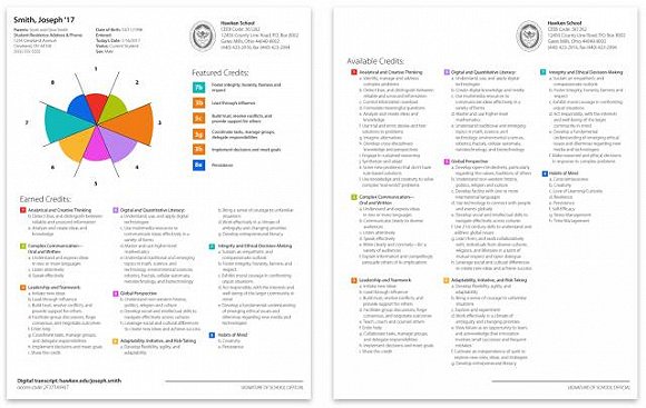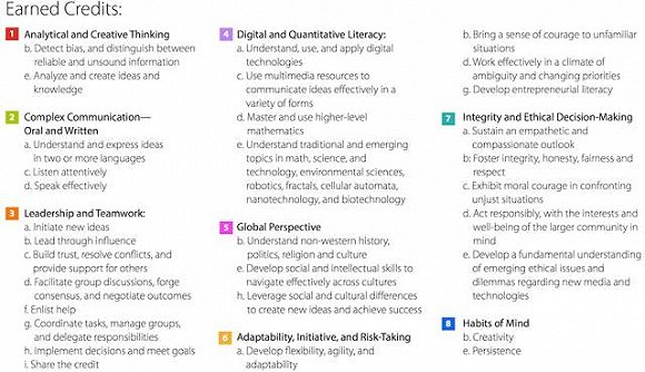 右边的一页纸是 A New Model 在高中期间持续追踪记录、评估的学生的 8项能力,每个大项中还有若干小项。 左边那页纸是评估结果:一份模拟的学生档案。 档案左上方显示了这个叫 “ 史密斯 ” 的男生的姓名、父母、住址、生日、性别等个人信息。 然后用一张饼图直观表现了对史密斯 8 项能力的评估结果,哪项强(第 3、7项),哪项弱(第1、5项),一目了然。  饼图右侧是 “ Featured Credits ”,即史密斯的具体特长。综上,从饼图和特长两项,就可以得出史密斯是个领导型人才的结论,且具体具备哪些领导素质清晰明了。  档案的下半部分是 “ Earned Credits ”,即史密斯同学所具备的能力,涵盖了 8 大项、61 个小项中的 31 个小项。 史密斯同学的档案只是一个模拟,真正的档案是一款软件,可以点击进入每一项,查看学生高中期间的相关资料,包括作业、报告、考试、活动、老师评语等各种材料。未来,每个学生一入学就会建立档案,并开始持续不断地动态更新,高中毕业申请大学的时候一键点击、即可提交,不需要再另行准备材料。 这将是一份持续更新的全息档案,一点一滴的努力、能力都纤毫毕现。也就是说,“ 平时不努力、临时抱佛脚、刷题考高分 ” 的人,认识大牛能搞到推荐信的人,总之,任何投机取巧走捷径的人,都没空子可钻了。 MTC 表示,未来 A New Model 会扩展到公立中学,全面改写美国大学的录取方式。总的来说,对比传统的评分制,A New Model有三大特征。 其一:不看成绩——学生档案上没有课程名称 A New Model是“能力导向”。每修得一门课程,学生将收获对应的能力学分(Mastery Credits),模拟学生档案分为两部分,一部分是学生拿到的具体能力学分(Earned Credits),没有了评级和分数;另一部分,是学生的8大能力总览。 其二:动态记录,一目了然 A New Model的格式都是统一的,而且简洁、直观,大学招生官们只要花两分钟就能了解一个学生的具体能力。 MTC联盟正在努力为A New Model开发一个技术平台,实现电子记录——实时更新学生的能力学分,并且会提供学生的课堂作品、论文、视频展示等等材料,还会提供每个学校的评分标准——这些都能为大学挑选学生提供直观且可靠的依据。 其三:学校拥有极大自主性 虽然能力鉴定模板是固定的,但每个学校可以自行决定对学生能力的评判标准——学校也可以根据自己的需求和培养目标,划定哪些才是学生应该重点把握的能力。 8大项能力61个小指标。整个电子档案记录、评估的内容包括: 1、分析和创造性思维 a、定义、管理及处置复杂问题(Identify, manage and address complex problems) b、辨别信息的真伪、偏差及其是否全面(Detect bias, and distinguish between reliable and unsound information) c、应对信息过载(Control information overload) d、提出有意义的问题(Formulate meaningful questions) e、分析、创造概念和知识(Analyze and create ideas and knowledge) f、用试错、测试等方法解决问题(Use trial and error; devise and test solutions to problems) g、从多角度看问题(Imagine alternatives) h、建立跨学科的知识和视野(Develop cross-disciplinary knowledge and perspectives) i、能持续推理(Engage in sustained reasoning) j、融合与适应(Synthesize and adapt) k、解决没有依据可循的新问题(Solve new problems that don’t have rule-based solutions) l、运用知识和创造力去解决复杂的真实问题(Use knowledge and creativity to solve complex “ real-world ” problems) 2、复杂沟通——口头及书面表达 a、用 2 种及以上语言去理解和表达(Understand and express ideas in two or more languages) b、与不同类型的受众清晰交流(Communicate clearly to diverse audiences) c、用心倾听(Listen attentively) d、有效的口头表达(Speak effectively) e、向不同类型的受众进行清晰简明的书面表达(Write clearly and concisely—for a variety of audiences) f、阐明信息并有效地说服他人(Explain information and compellingly persuade others of its implications) 3、领导力及团队合作能力 a、提出新想法(Initiate new ideas) b、通过影响力领导(Lead through in influence) c、赢得信任、解决冲突、为他人提供支持(Build trust, resolve conflicts, and provide support for others) d、领导小组讨论、达成共识、有效谈判(Facilitate group discussions, forge consensus, and negotiate outcomes) e. 做他人的老师、教练、顾问(Teach, coach and counsel others) f、寻求帮助(Enlist help) g、完成协作任务、管理团队、分配任务(Collaborate tasks, manage groups, and delegate responsibilities) h、执行决策、达成目标、分享荣誉(Implement decisions and meet goals i. Share the credit) 4、信息技术及数理能力 a、理解、运用信息技术(Understand, use, and apply digital technologies) b、创建数字知识和媒体(Create digital knowledge and media) c、在不同场景下运用多媒体资源进行有效沟通(Use multimedia resources to communicate ideas e ffectively in a variety of forms) d、掌握并运用高阶数学(Master and use higher-level mathematics) e、了解传统及前沿的数学、科学、技术、环境科学、机器学、分形学、细胞自动机、纳米技术、生物技术等热门议题(Understand traditional and emerging topics in math, science, and technology, environmental sciences, robotics, fractals, cellular automata, nanotechnology, and biotechnology) 5、全球视野 a、对他人不同的价值观和习俗保持开放的心态(Develop open-mindedness, particularly regarding the values, traditions of others) b、理解非西方的历史、政治、宗教、文化(Understand non-western histor