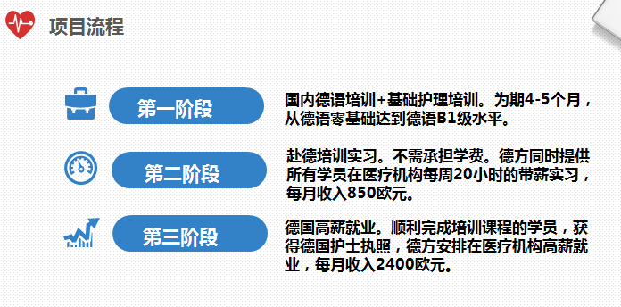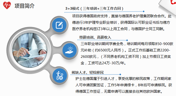 • 项目获得德国政府支持,直接与德国医疗护理职业联合会合作,保证签证。 • 0基础人员赴德工作+学习3年,获得职业证书后,德国校方及合作伙伴将保证直接为毕业生安排在德工作,并无偿提供后续就业上的各方面支持。